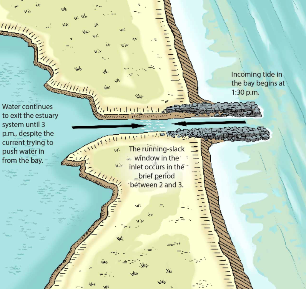 To find a running-slack window, you must remember that changes in inshore current typically do not correspond perfectly with tide changes. Let’s use a ­hypothetical example to clarify. The tide chart for a buoy outside a small inlet says incoming tide begins at 1:30 p.m. While you might assume incoming current inside the inlet also begins at 1:30 because the incoming tide will push water into the inlet, that’s probably not the case. Instead, you might need to wait until 3 p.m. before the current exiting the backwater completely turns around, overpowered by the incoming tide.